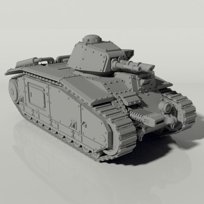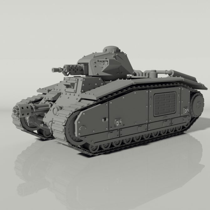 The Grim Char B1 Battle Tank includes rotating turret, elevating hull weapon and rotating sponson weapons with pre-made holes for weapon magnetization as well as a compartment in the hull to hold extra weapons. The sponsons are prepped to be magnetized from the inside so you can choose to use them or not and the magnets are not visible on the bare hull. It is the perfect size for heroic 28mm wargaming.